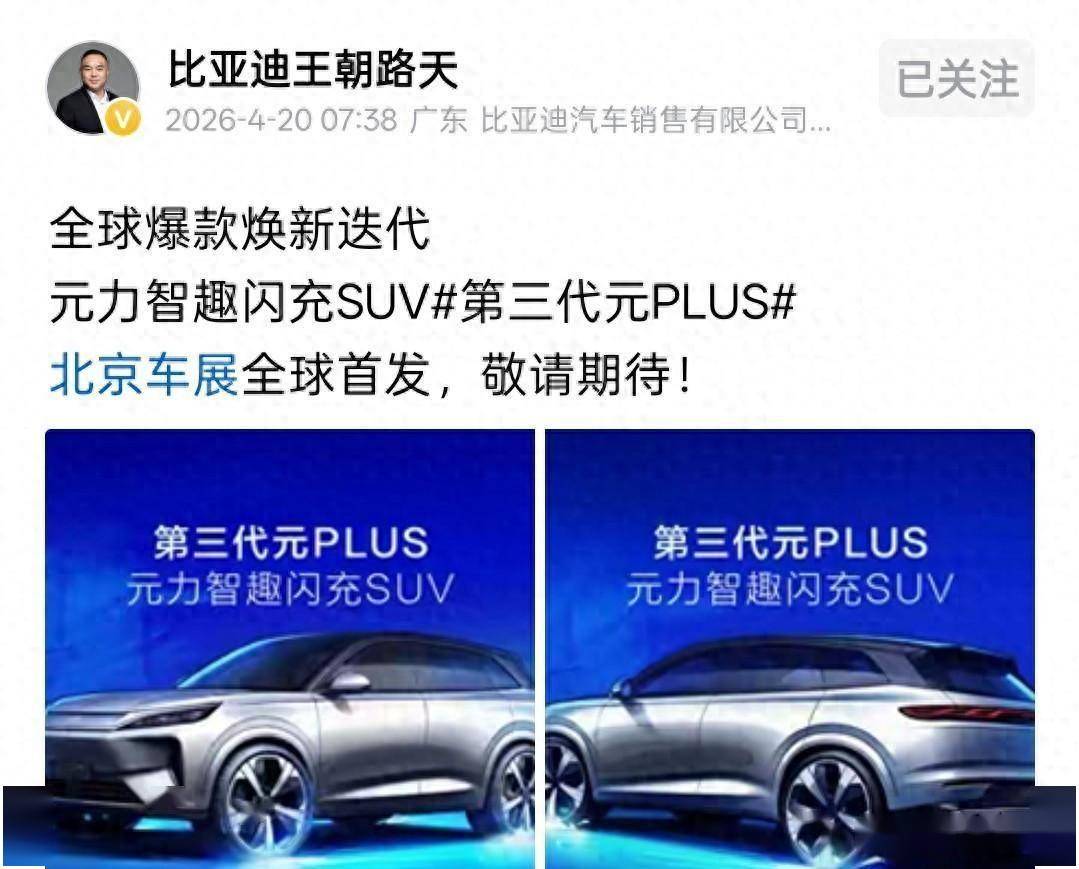 97国际-至尊品牌,源于信誉-4月20日,比亚迪王朝网销售事业部总经理路天发布了第三代元PLUS的预告图,并正式宣布这款新车将于4月24日开幕的2026北京车展全球首发。 这款基于e平台3.0 Evo打造的紧凑型纯电SUV,定位为“元力智趣闪充SUV”。