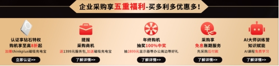 活动期间,企业提报采购商机即可获赠「价值1399元专属服务包」,涵盖设备售后咨询、故障排查等贴心服务,减少企业后续运维顾虑;同时加赠thinkplus磁吸充电宝,进一步降低企业配件采购成本。